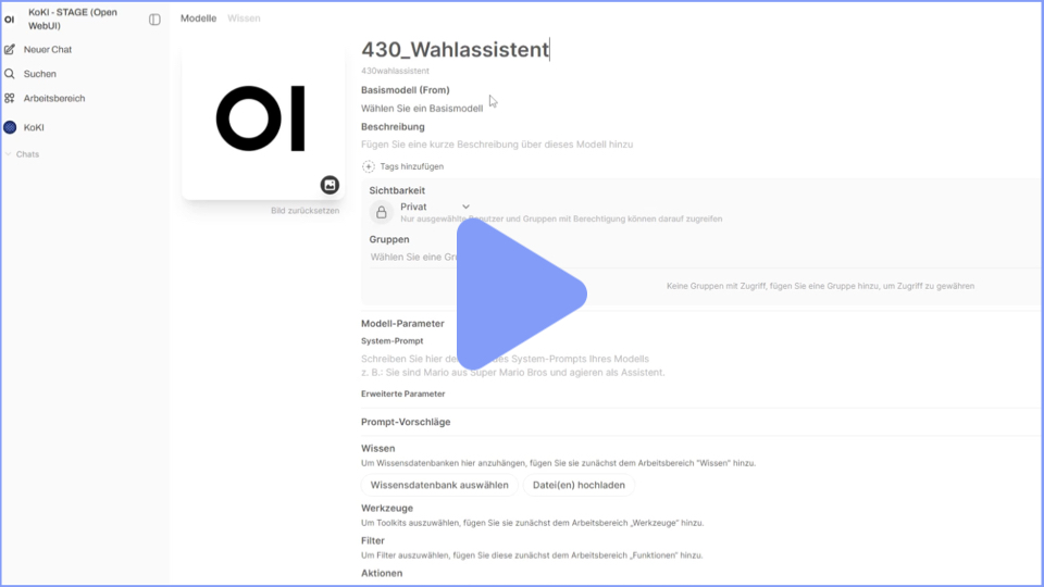 Anleitungen Anleitung zur Bedienung (Oberfläche) Kurzes Video (knapp 6 min.) Anleitung zum Erstellen von Assistenten Kurzes Video (ca. 3 min.) Informationen zu Testzugängen PDF zum Download Anleitung Websuche PDF zum Download Anleitung Skills PDF zum Download Anleitung Promptshortcuts PDF zum Download